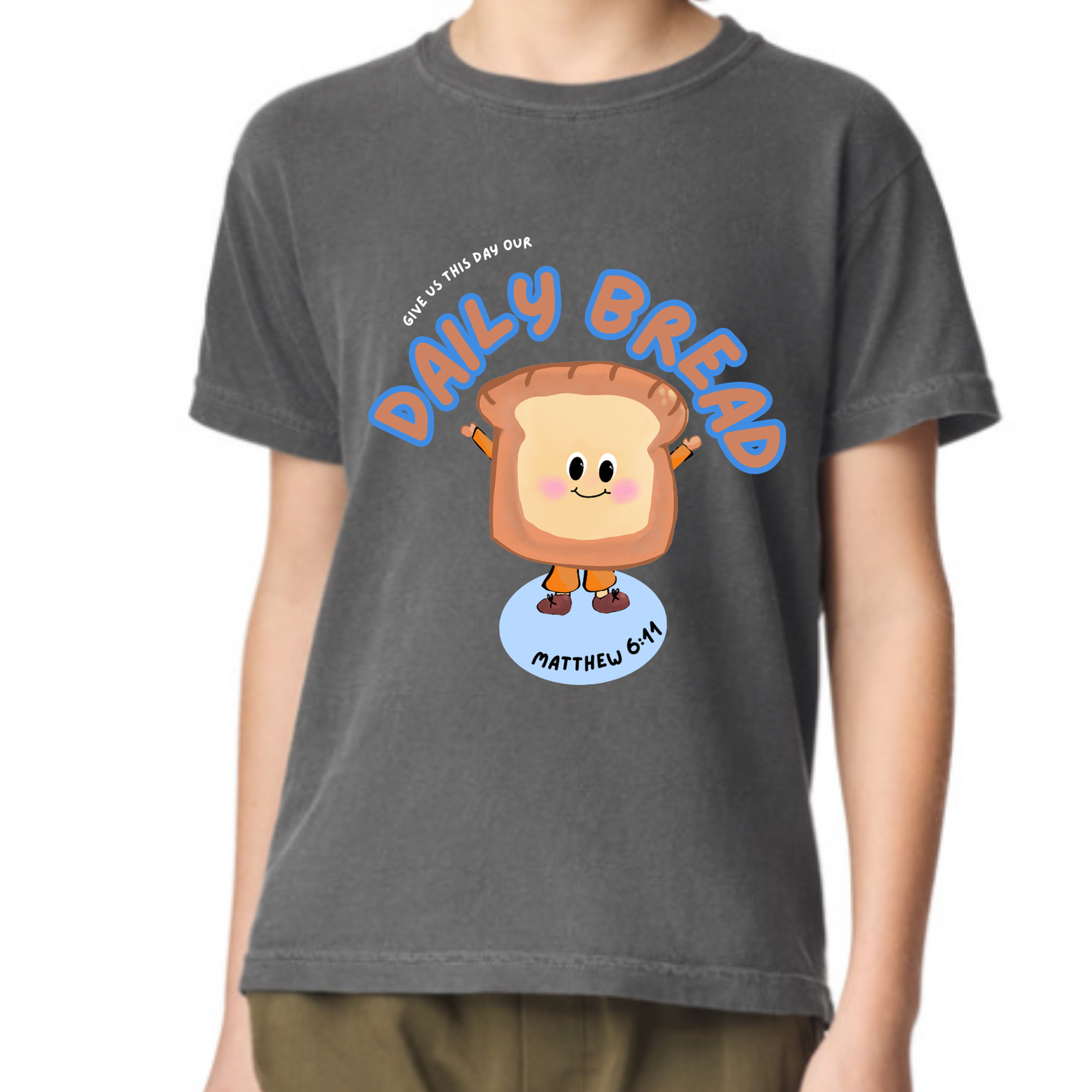 Daily Bread shirt – This kids and youth T-shirt features my original cartoon bread graphic and comes in the colour yellow. Inspired by the Bible verse, "Give us this day our daily bread" found in the Lords Prayer written in Matthew 6:11.