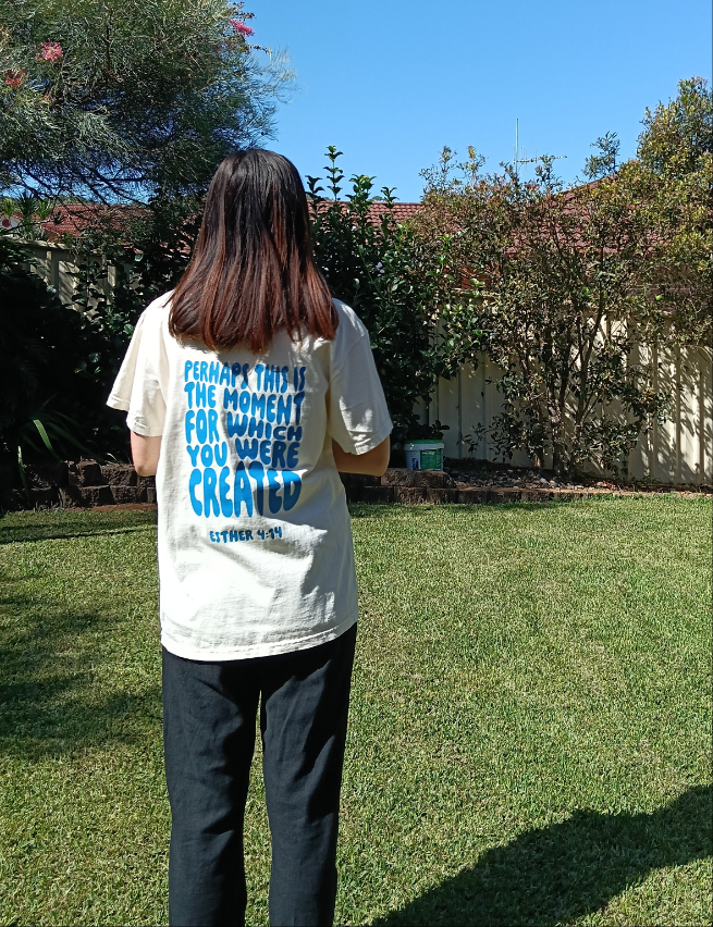 This original design shares the verse from the story of Esther found in Esther 4:14 "perhaps this is the moment for which you were created." Wear this shirt to remind yourself and your neighbourhood of the unfailing promises of God.