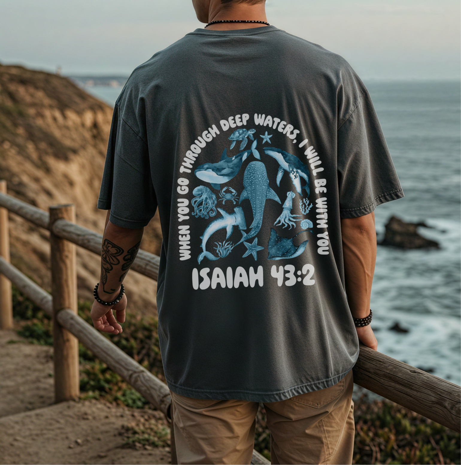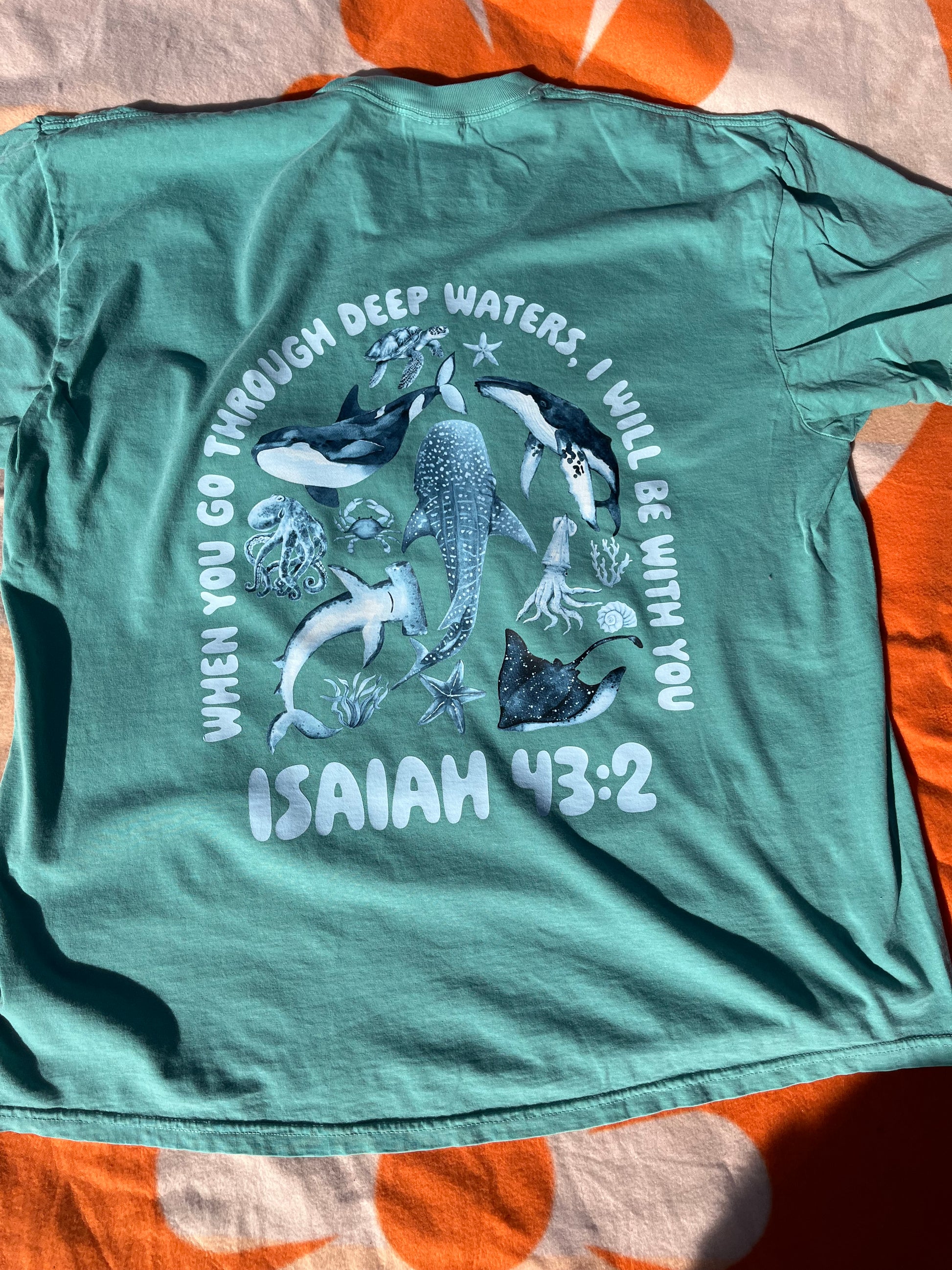 This shirt has my original 'Isaiah 43:2' design on the back with the verse: "When you go through deep waters I will be with you." On the front centre of the shirt there is the verse 'Isaiah 43:2' above a graphic of a whale.