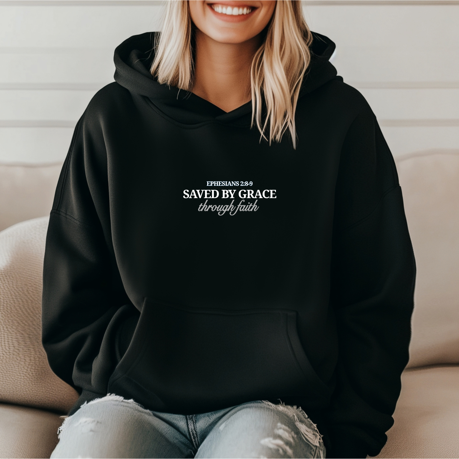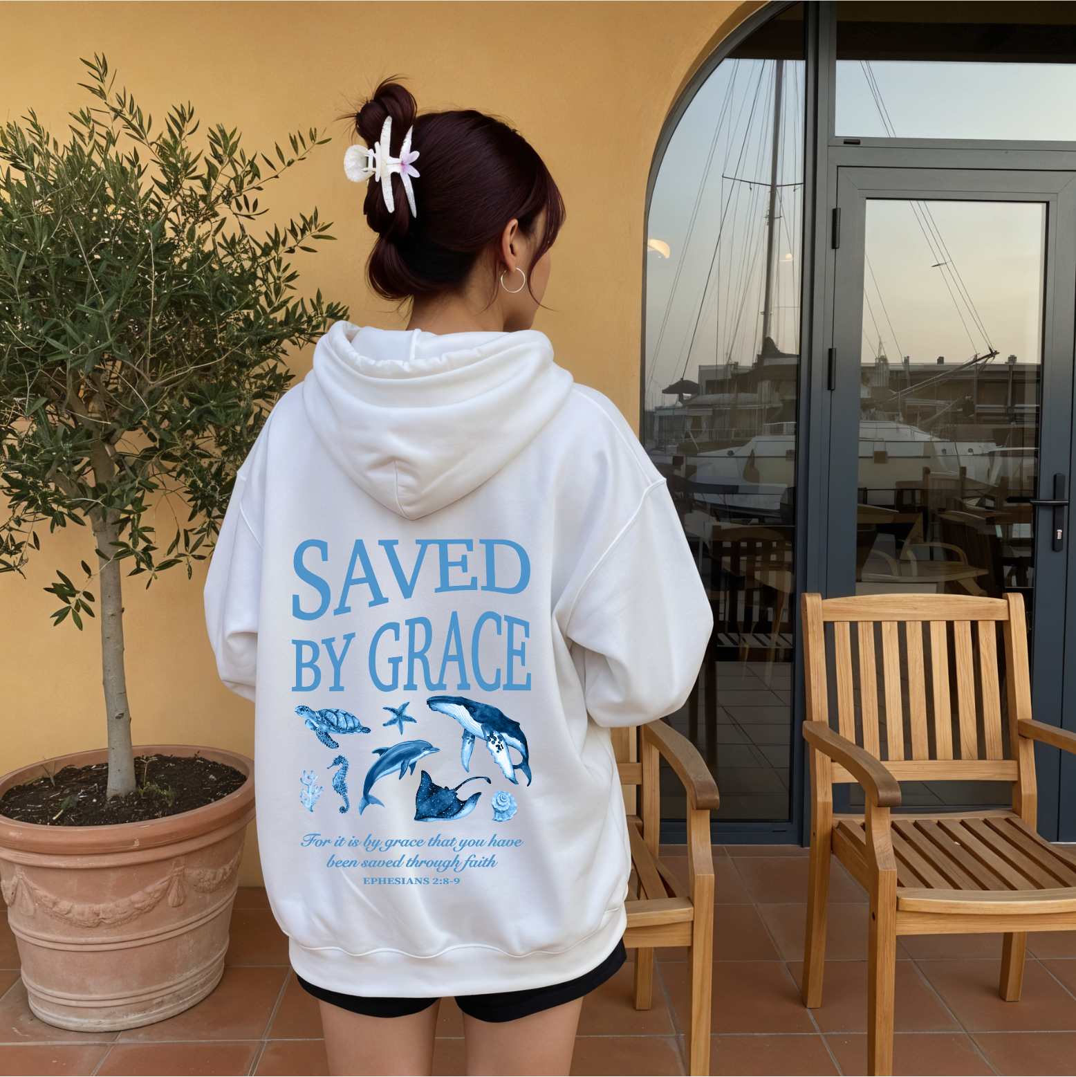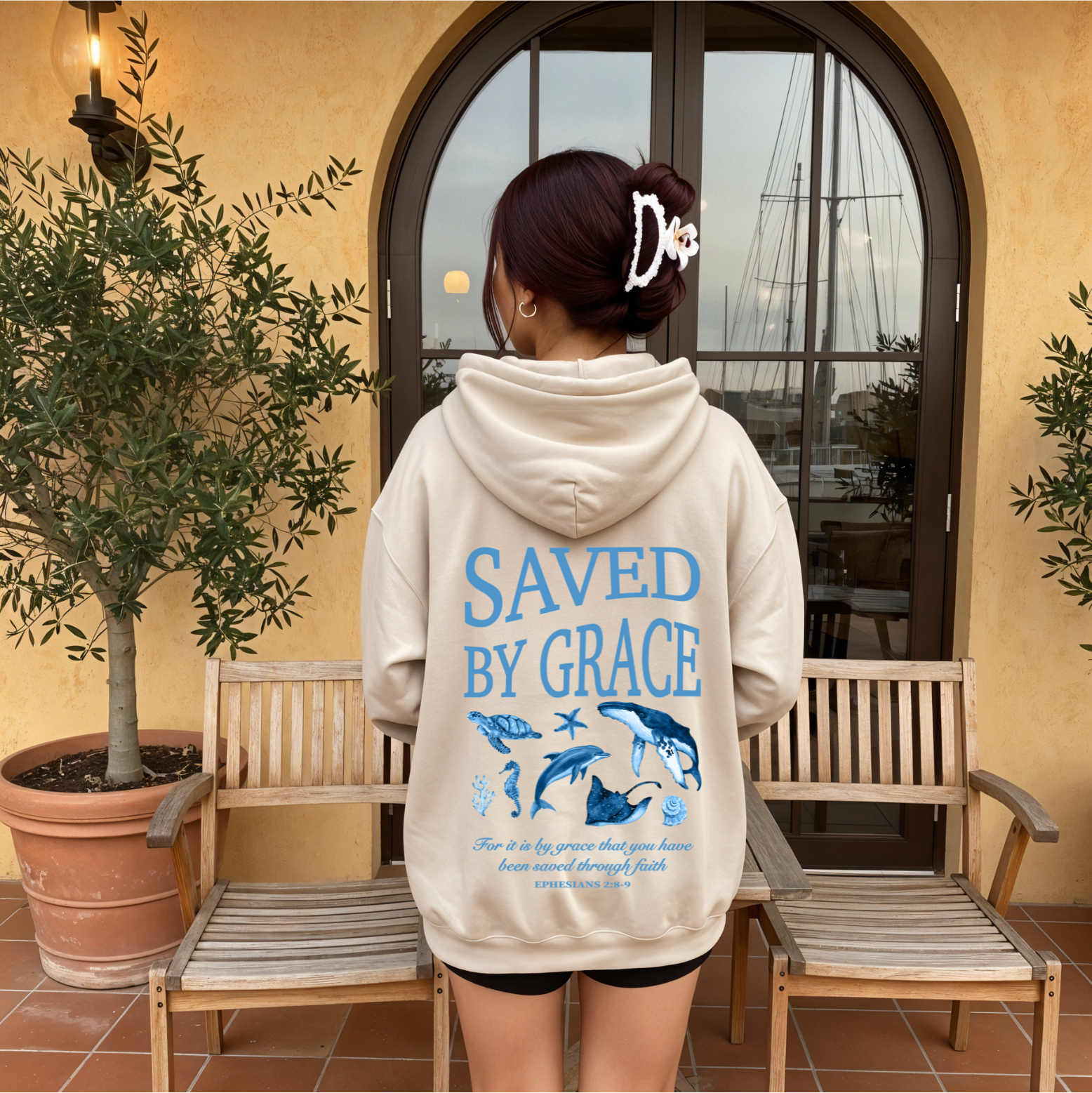 Let this hoodie be a reminder that God’s grace is deeper than the sea. Featuring a gentle ocean inspired design on the back with playful sea creatures surrounding the powerful words of Ephesians 2:8–9:
